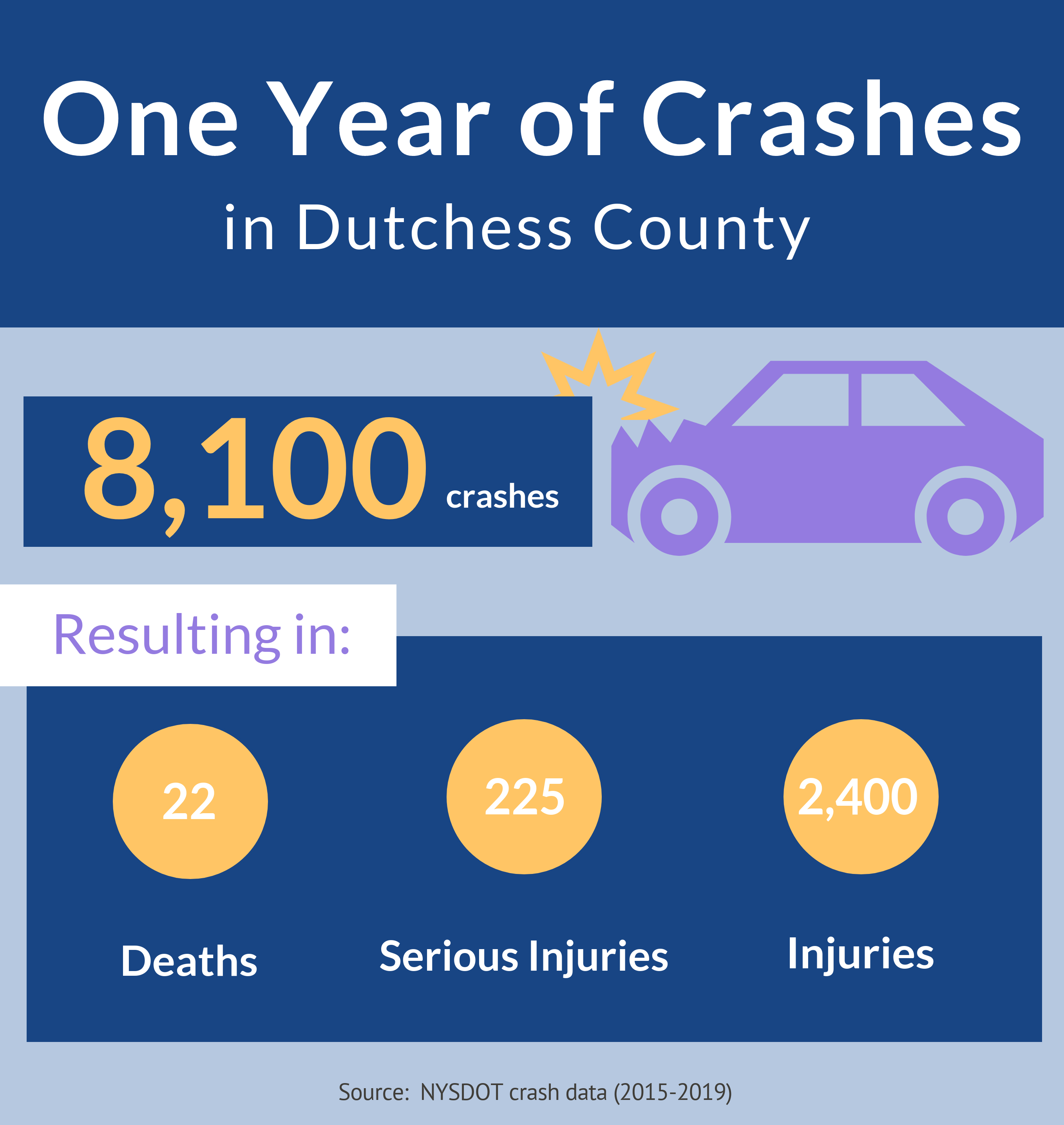 Vehicle crashes are a leading cause of death across the world, in our country, state, and here in Dutchess County. We hear about crashes so often that they seem inevitable. But crashes are not inevitable—they are often predictable and almost always preventable. And behind every crash is a mother or father, sister or brother, daughter or son; a friend; a neighbor; a classmate or colleague. Understanding the patterns behind where crashes happen and why they happen can help us prevent them.
